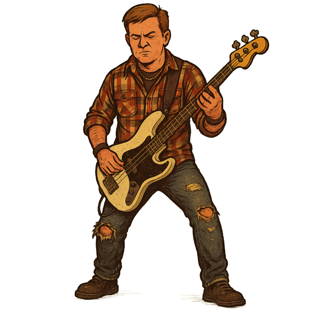 Now rocking the foundation for Shredding Flannel, Scott brings his signature blend of punchy tone and grungy nostalgia to every show. The band’s 90s repertoire? It’s the exact stuff he used to line up for at midnight CD releases—back when music came with liner notes and questionable fashion choices. These Gen X jams still hit hard, and Scott’s on a mission to keep them alive, loud, and low.